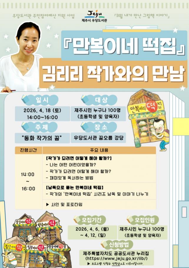 °¿¬Àº Á¦ÁֽùΠ´©±¸³ª Âü¿©ÇÒ ¼ö ÀÖÀ¸¸ç, Âü¿© ½ÅûÀº 4¿ù 6ÀϺÎÅÍ 4¿ù 12ÀϱîÁö Á¦ÁÖÆ¯º°ÀÚÄ¡µµ °ø°øµµ¼°ü ´©¸®Áý(lib.jeju.go.kr)À» ÅëÇØ ¿Â¶óÀÎÀ¸·Î Á¢¼öÇÏ¸é µÈ´Ù. ¸ðÁý ÀοøÀº 100¸íÀ¸·Î ¼±Âø¼ø ¸¶°¨µÈ´Ù. ¡Ø ¹®ÀÇ: ¢Ï064-728-8343