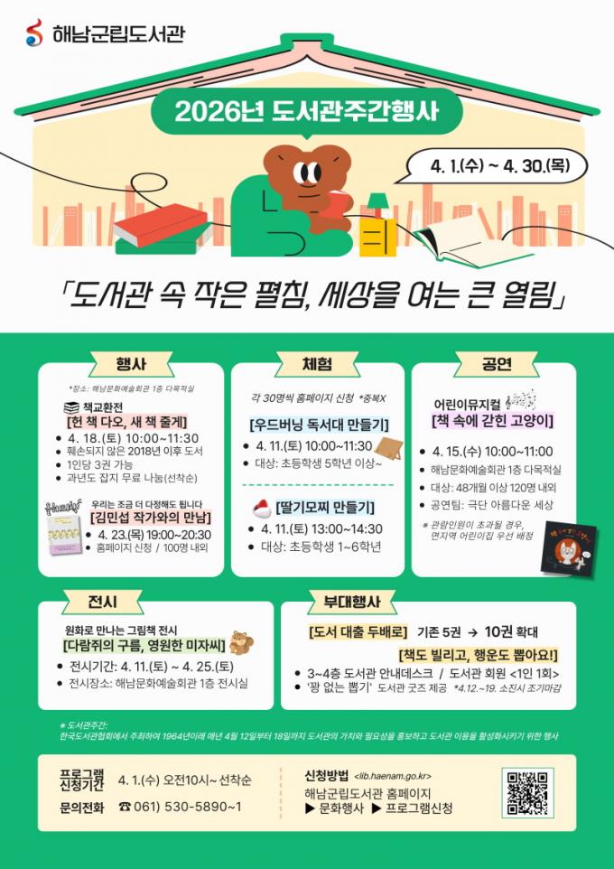 [½Ã»çÁ¾ÇսŹ® = °­À±¿À ±âÀÚ] ÇØ³²±º¸³µµ¼­°üÀº 4¿ù 12~18ÀÏ µµ¼­°ü ÁÖ°£À» ¸Â¾Æ¡®µµ¼­°ü ¼Ó ÀÛÀº Æîħ, ¼¼»óÀ» ¿©´Â Å« ¿­¸²¡¯À» ÁÖÁ¦·Î ´Ùä·Î¿î µ¶¼­¹®È­ Çà»ç¸¦ ¿î¿µÇÑ´Ù.