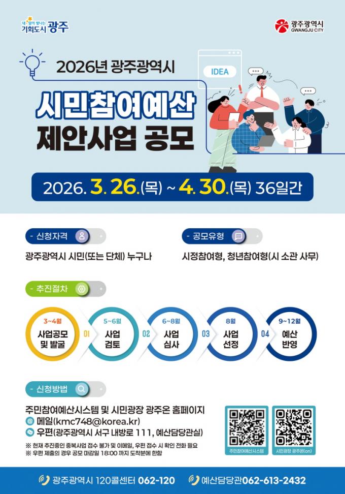 ±¤Áֽô Á¢¼öµÈ Á¦¾È»ç¾÷¿¡ ´ëÇØ ¼Ò°üºÎ¼ °ËÅä, ½Ã¹ÎÅõÇ¥, ½Ã¹ÎÂü¿©¿¹»êÀ§¿øÈ¸ÀÇ ½ÉÀÇ µîÀ» °ÅÃÄ 2027³â ¿¹»ê¾È¿¡ ¹Ý¿µÇÒ ¿¹Á¤ÀÌ´Ù. ÀÌÈÄ ±¤ÁÖ½ÃÀÇȸ ½ÂÀÎÀ» ¹ÞÀ¸¸é »ç¾÷ÀÌ ÃÖÁ¾ È®Á¤µÈ´Ù.