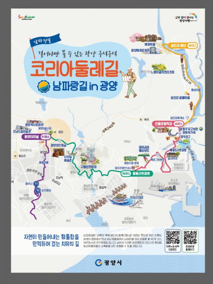 ÇÑÆí, ÄÚ¸®¾ÆµÑ·¹±æÀº µ¿Çؾȡ¤¼­Çؾȡ¤³²Çؾȡ¤DMZ ÆòÈ­ÀÇ ±æÀ» ¿¬°áÇÑ ¾à 4,500km ±Ô¸ðÀÇ µµº¸ ¿©Çà±æÀÌ´Ù. ÀÌ °¡¿îµ¥ ³²ÆÄ¶û±æÀº ºÎ»ê¿¡¼­ ÇØ³²±îÁö ³²ÇؾÈÀ» µû¶ó À̾îÁö´Â ±¸°£À¸·Î, ÇØ¾È°ú µµ½Ã dz°æÀ» ÇÔ²² Áñ±æ ¼ö ÀÖ´Â °È±â ±æÀÌ´Ù. ƯÈ÷ ±¤¾ç ±¸°£Àº ¼¶Áø°­°ú ±¤¾ç¸¸, µµ½É°ú »ê, ¹®È­¿¹¼ú ÀÚ¿øÀÌ ¿¬°áµÅ ÀÖ¾î »ç°èÀý ´Ù¾çÇÑ Å׸¶¸¦ Áñ±æ ¼ö ÀÖ´Â °ÍÀÌ Æ¯Â¡ÀÌ´Ù.