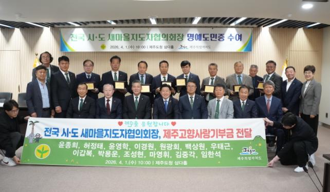 Á¦ÁÖµµ´Â 1ÀÏ ¿ÀÀü µµÃ» »ï´ÙȦ¿¡¼ Àü±¹ ½Ãµµ »õ¸¶À»ÁöµµÀÚÇùÀÇȸÀå ¸í¿¹µµ¹ÎÁõ ¼ö¿©½ÄÀ» ¿¾ú´Ù. Çà»ç¿¡´Â ¾çÀ±È£ »õ¸¶À»ÁöµµÀÚÁß¾ÓÇùÀÇȸÀåÀ» ºñ·ÔÇØ Àü±¹ °¢ ½Ãµµ¸¦ ´ëÇ¥ÇÏ´Â ÇùÀÇȸÀå µî 20¸íÀÌ Âü¼®Çß´Ù.