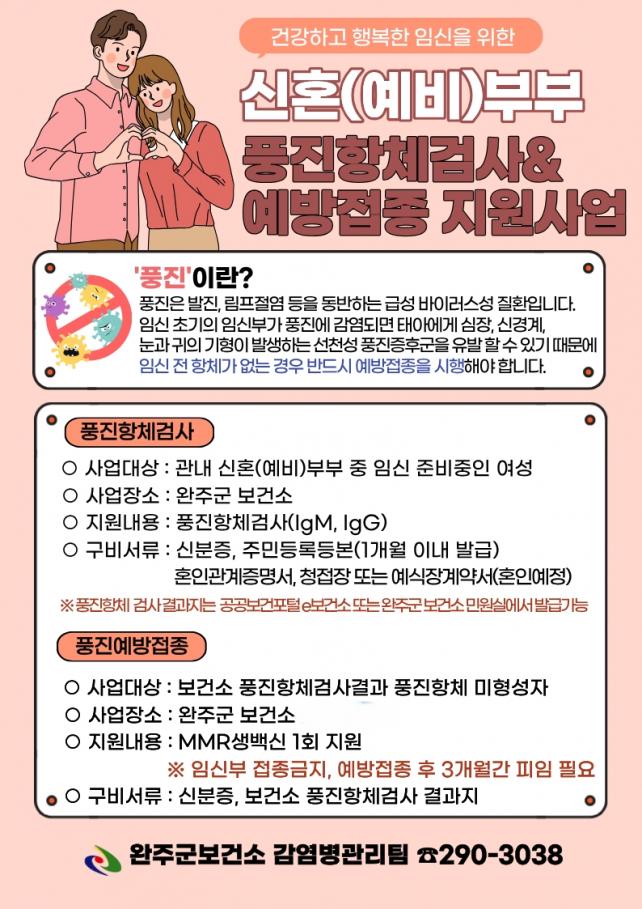 dzÁø ¿¹¹æÁ¢Á¾Áö¿ø »ç¾÷Àº °ü³» ÀÓ½ÅÀ» Áغñ ÁßÀÎ ½ÅÈ¥(¿¹ºñ)ºÎºÎ ¿©¼ºÀ» ´ë»óÀ¸·Î ÁøÇàµÇ¸ç, º¸°Ç¼Ò¿¡¼ dzÁø Ç×ü°Ë»ç(IgM, IgG)¸¦ ¹«·á·Î ¹ÞÀ» ¼ö ÀÖ°í, °Ë»ç °á°ú Ç×ü°¡ ¾ø´Â °æ¿ì¿¡´Â È«¿ª¡¤º¼°Å¸®¡¤Ç³Áø(MMR) ¿¹¹æÁ¢Á¾À» 1ȸ Áö¿øÇÑ´Ù.