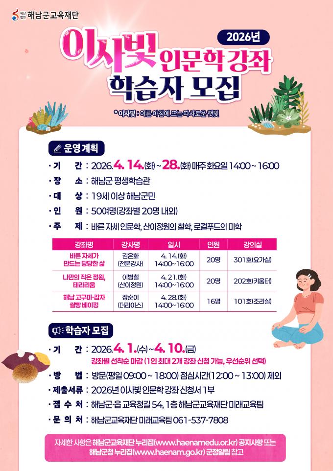 ÇнÀÀÚ ¸ðÁýÀº 4¿ù 1ÀϺÎÅÍ 10ÀϱîÁö ±³À°Àç´Ü ¹æ¹® Á¢¼ö¸¦ ÅëÇØ ÁøÇàµÇ¸ç 1ÀÎ ÃÖ´ë 2°³ °Á±îÁö ¹«·á·Î ½Åû °¡´ÉÇÏ´Ù. ¸ðÁý ÀοøÀº °Áº° 20¸í ³»¿ÜÀÌ¸ç ¸ðµç °Á´ ¸ÅÁÖ È¿äÀÏ ¿ÀÈÄ 2½ÃºÎÅÍ 4½Ã±îÁö ÇØ³²±º Æò»ýÇнÀ°ü¿¡¼ ÁøÇàµÈ´Ù.