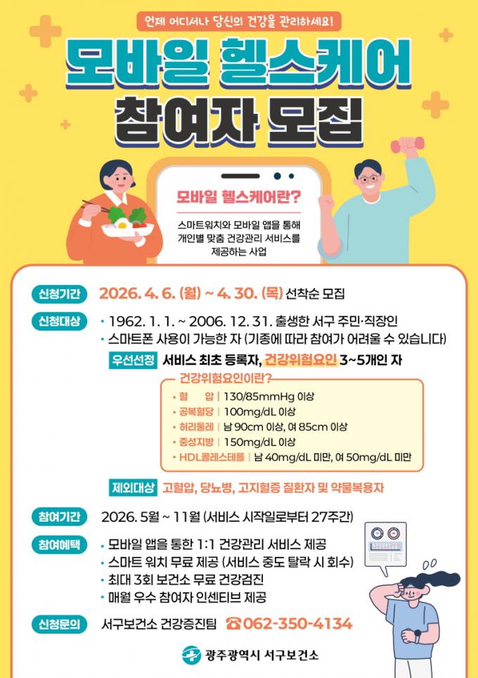 [½Ã»çÁ¾ÇսŹ® = ¿À½ÂÅà ±âÀÚ] ±¤ÁÖ±¤¿ª½Ã ¼­±¸(±¸Ã»Àå ±èÀ̰­)°¡ Áö¿ªÁÖ¹ÎÀÇ °Ç°­°ü¸® ¿ª·® °­È­¸¦ À§ÇØ Á¤º¸Åë½Å±â¼ú(ICT)À» Ȱ¿ëÇÑ °Ç°­°ü¸® ¼­ºñ½º ¡®¸ð¹ÙÀÏ ÇコÄɾ Âü¿©ÀÚ 125¸íÀ» ¿À´Â 30ÀϱîÁö ¼±Âø¼ø ¸ðÁýÇÑ´Ù.