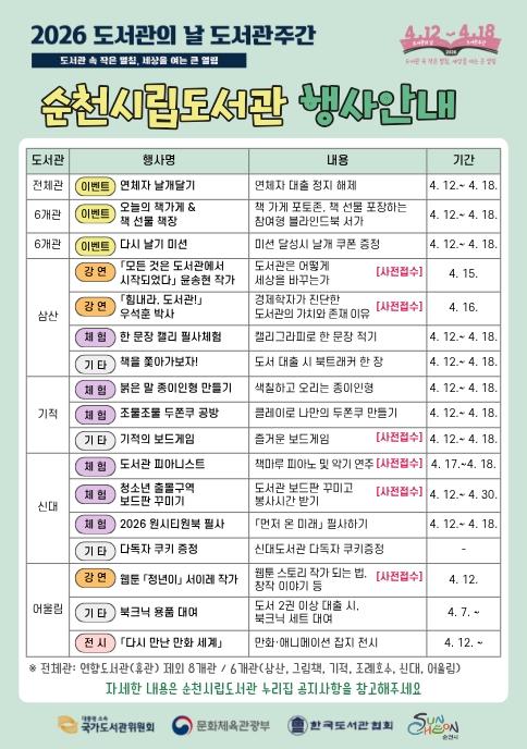±âŸ ÀÚ¼¼ÇÑ »çÇ×Àº ¼øÃµ½Ã¸³µµ¼°ü ´©¸®Áý(https://library.suncheon.go.kr/) ¶Ç´Â °¢ µµ¼°üÀ¸·Î ¹®ÀÇÇÏ¸é µÈ´Ù.