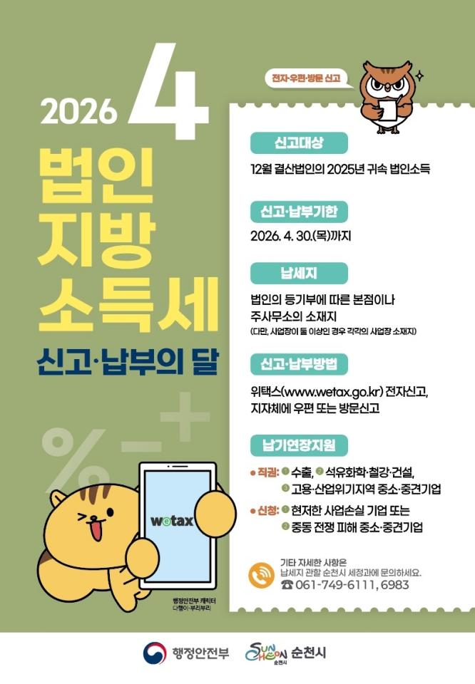 ½Å°í ´ë»óÀº 12¿ù ¸» °á»ê¹ýÀÎÀÇ 2025³â ±Í¼Ó ¹ýÀμҵæÀ¸·Î, »ç¾÷½ÇÀûÀÌ ¾ø°Å³ª °á¼ÕÀÌ ¹ß»ýÇÑ ¹ýÀεµ Æ÷ÇԵȴÙ. ½Å°í´Â À§Åýº¸¦ ÅëÇÑ ÀüÀÚ½Å°í ¶Ç´Â ¼øÃµ½Ã ¼¼Á¤°ú·Î ¿ìÆí¡¤¹æ¹® ½Å°íµµ °¡´ÉÇÏ´Ù.