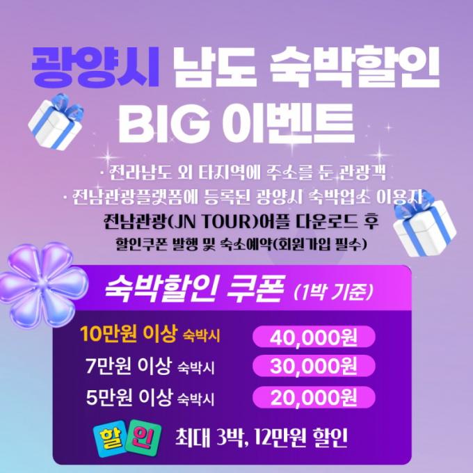 À̹ø À̺¥Æ®´Â Àü¶ó³²µµ¿Í ±¤ÁÖ±¤¿ª½Ã¸¦ Á¦¿ÜÇÑ Áö¿ª¿¡ ÁÖ¼Ò¸¦ µÐ °ü±¤°´ÀÌ Àü³² Áö¿ª ¼÷¹Ú¾÷¼Ò¸¦ ÀÌ¿ëÇÒ °æ¿ì ÇÒÀÎ ÇýÅÃÀ» Á¦°øÇÏ´Â »ç¾÷À¸·Î, 4¿ùºÎÅÍ 11¿ù±îÁö ¿¹»ê ¹üÀ§ ³»¿¡¼ ¿î¿µµÈ´Ù.