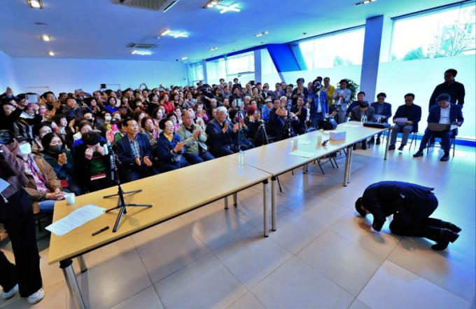 ¹Ú¼ºÇö ¿¹ºñÈ帰¡ Áö³­ 10ÀÏ ¿ÀÈÄ ¼±°Å»ç¹«¼Ò Å»´ç ±âÀÚȸ°ß¿¡¼­ ½Ã¹Îµé¿¡°Ô °æ¼± ºÒÂü¿¡ ´ëÇÑ »ç°ú ÀÔÀåÀ» ¹àÈ÷¸ç Å« ÀýÀ» ¿Ã¸®°í ÀÖ´Ù.