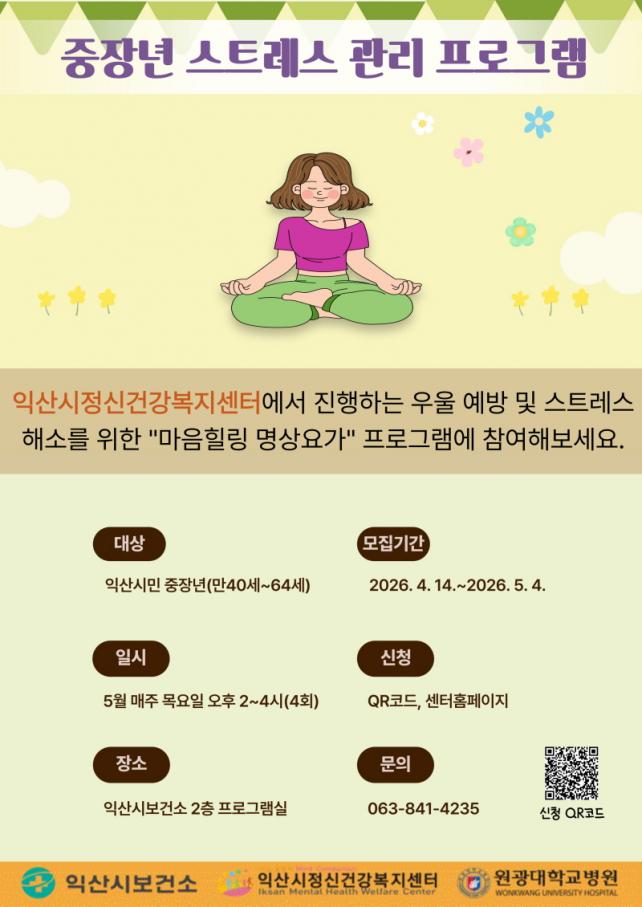 ÀÍ»ê½ÃÁ¤½Å°Ç°º¹Áö¼¾ÅÍ´Â ¸¸ 40~64¼¼ ÁßÀå³âÀ» ´ë»óÀ¸·Î '¸¶À½Èú¸µ ¸í»ó¿ä°¡' ÇÁ·Î±×·¥À» ¿î¿µÇÑ´Ù°í 13ÀÏ ¹àÇû´Ù.