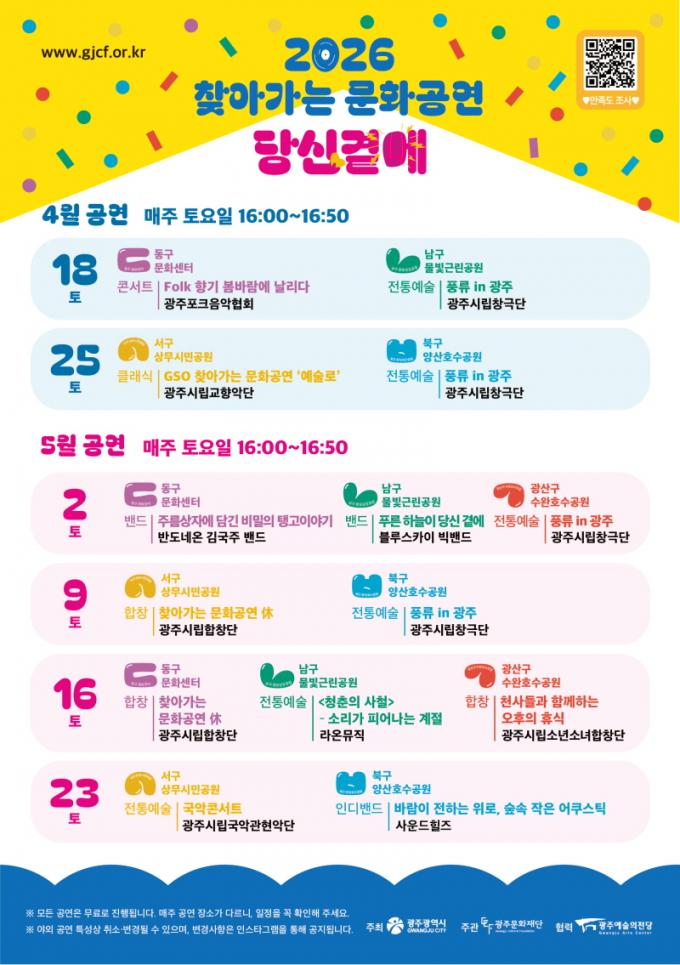 ¿ÃÇØ ù ¸·À» ¿Ã¸®´Â 4¿ù18ÀÏ °ø¿¬Àº µ¿±¸¿Í ³²±¸¿¡¼­ °¢°¢ ÁøÇàµÈ´Ù. µ¿±¸¹®È­¼¾ÅÍ¿¡¼­´Â ±¤ÁÖÆ÷Å©À½¾ÇÇùȸÀÇ ¡®Äܼ­Æ®–Æ÷Å©(Folk), Çâ±â º½¹Ù¶÷¿¡ ³¯¸®´Ù¡¯ ¹êµå °ø¿¬ÀÌ, ³²±¸ ¹°ºû±Ù¸°°ø¿ø¿¡¼­´Â ±¤Áֽø³Ã¢±Ø´ÜÀÇ ¡®Ç³·ù ÀÎ(in) ±¤ÁÖ¡¯ ÀüÅ뿹¼ú °ø¿¬ÀÌ ¹«´ë¿¡ ¿À¸¥´Ù.