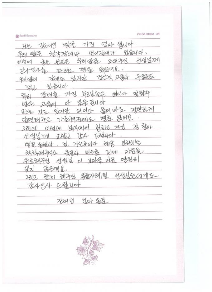 ¾î¸Ó´Ï´Â ÆíÁö¿¡¼ ¡°Ã»°¢Àå¾Ö¿Í ¾ð¾îÀå¾Ö»Ó ¾Æ´Ï¶ó Á¤½ÅÀû °íÅë±îÁö °Þ´Â µþÀ» º¸¸ç ¾îµð¿¡µµ ¸»ÇÒ °÷ÀÌ ¾ø¾î ¸·¸·Çß´Ù¡±¸ç ¡°º´¿ø µ¿ÇàºÎÅÍ ÇàÁ¤ ÀýÂ÷±îÁö ¼¼½ÉÇÏ°Ô µµ¿ÍÁֽðí, ´Ã ¿ôÀ½°ú µû¶æÇÑ ¸»·Î À§·ÎÇØÁֽм±»ý´Ô²² ±íÀÌ °¨»çµå¸°´Ù¡±°í ÀüÇß´Ù. ¶ÇÇÑ ¡°ÀÌ °í¸¶¿òÀ» Æò»ý ÀØÁö ¾Ê°Ú´Ù¡±°í µ¡ºÙÀ̸ç ÅëÇÕ»ç·Ê°ü¸®ÆÀ¿¡ ´ëÇÑ ±íÀº °¨»çÀÇ ¶æÀ» ÀüÇß´Ù.