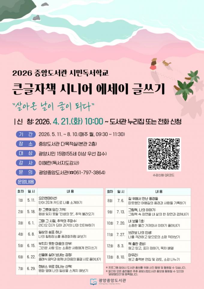 ÇÁ·Î±×·¥Àº 5¿ù 11ÀϺÎÅÍ 8¿ù 10ÀϱîÁö ¸ÅÁÖ ¿ù¿äÀÏ ¿ÀÀü 9½Ã 30ºÐ ±¤¾çÁß¾Óµµ¼°ü ´Ù¸ñÀû½Ç¿¡¼ ÃÑ 13ȸ¿¡ °ÉÃÄ ¿î¿µµÈ´Ù. ¸ðÁý ´ë»óÀº 55¼¼ ÀÌ»ó ±¤¾ç½Ã¹Î 15¸íÀ̸ç, ¼ö°·á´Â ¹«·á´Ù.