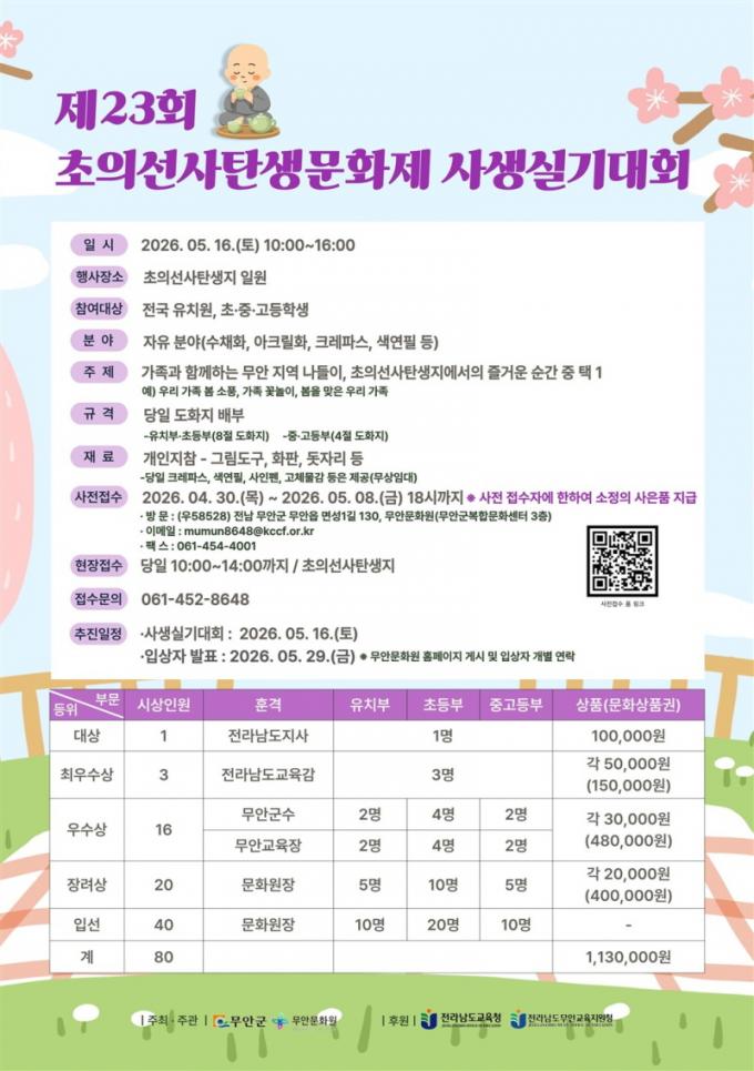 ¼ö»óÀÛÀº ÃÑ 80Á¡À¸·Î, ¼ö»óÀÚ¿¡°Ô´Â »óÀå(Àü¶ó³²µµµµÁö»ç, Àü¶ó³²µµ±³À°°¨, Àü¶ó³²µµ¹«¾È±³À°Áö¿øÃ»±³À°Àå, ¹«¾È±º¼ö, ¹«¾È¹®È¿øÀå)°ú ¼ÒÁ¤ÀÇ »óǰ±ÇÀÌ ¼ö¿©µÈ´Ù. ¼±Á¤µÈ ÀÛǰÀº ¹«¾ÈÀÇ ¹®È¼Ò½ÄÁö '¹®È¹«¾È'¿¡ ½Ç¸± ¿¹Á¤ÀÌ´Ù.