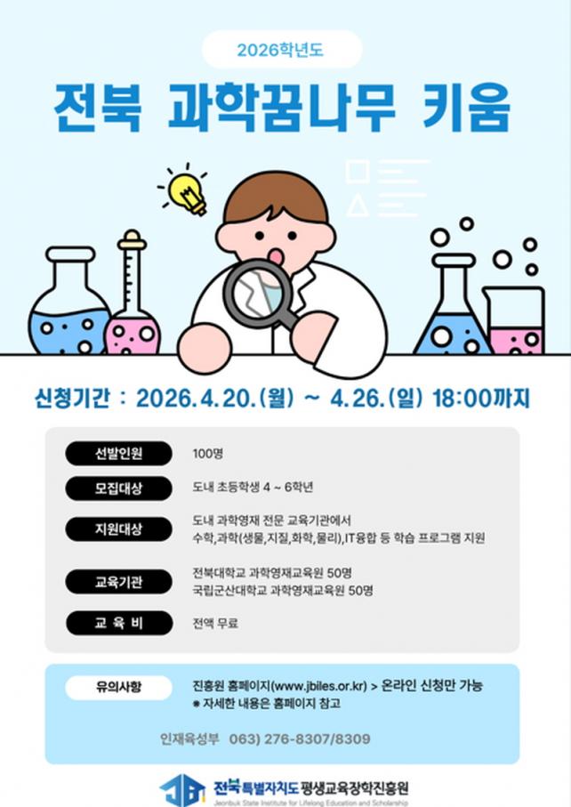 À̹ø »ç¾÷Àº ÁøÈï¿øÀÌ ÀüºÏ´ëÇб³ °úÇпµÀç±³À°¿ø ¹× ±¹¸³±º»ê´ëÇб³ °úÇпµÀç±³À°¿ø°ú Çù·ÂÇÏ¿© ¿î¿µÇϸç, µµ³» ÃʵîÇлý 4~6Çгâ 100¸í(ÀüºÏ´ë 50¸í, ±º»ê´ë 50¸í)À» ¼±¹ßÇØ ´ëÇÐÀÇ ¿ì¼öÇÑ ÀÎÇÁ¶ó¸¦ Ȱ¿ëÇÑ °úÇС¤¼öÇÐ Àü¹®±³À°À» Á¦°øÇÒ ¿¹Á¤ÀÌ´Ù.
