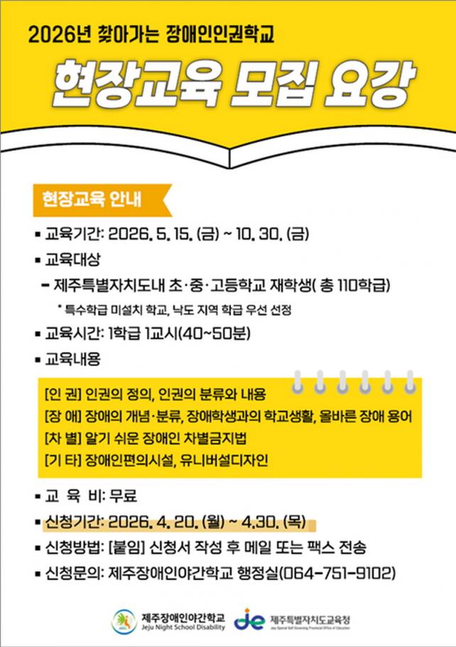 [½Ã»çÁ¾ÇսŹ® = °í¼º¹Î ±âÀÚ] Á¦ÁÖÀå¾ÖÀξ߰£Çб³(±³Àå °íÀºÈ£)´Â µµ³» Çлýµé¿¡°Ô Àå¾Ö¿¡ ´ëÇÑ ¿Ã¹Ù¸¥ ÀÌÇØ¿Í ÀÎ±Ç Ä£È­ÀûÀÎ ÅëÇÕ±³À° ȯ°æÀ» ¸¸µé±â À§ÇØ ¡®2026³â ã¾Æ°¡´Â Àå¾ÖÀÎÀαÇÇб³¡¯ ÇöÀå ±³À° Âü¿© ÇбÞÀ» ¸ðÁýÇÑ´Ù°í ¹àÇû´Ù.