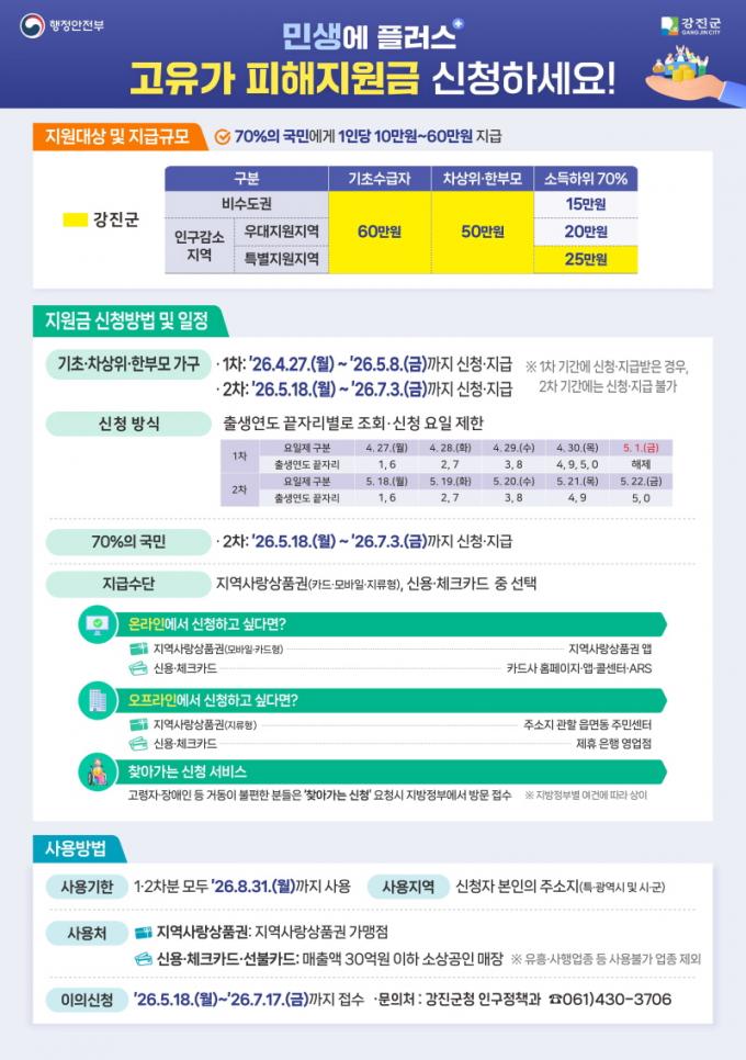 Áö±Þ ¹æ½ÄÀ¸·Î´Â ½Å¿ë¡¤Ã¼Å©Ä«µå ¹× ¸ð¹ÙÀÏ »óǰ±ÇÀ¸·Î ½ÅûÇÑ °æ¿ì ´ÙÀ½ ³¯ ÃæÀüµÇ¸ç, À¾¡¤¸é»ç¹«¼Ò ¹æ¹® ½ÅûÀÚ´Â Áö·ùÇü Áö¿ª»ç¶û»óǰ±ÇÀ¸·Î Áö±ÞµÈ´Ù. Áö¿ª»ç¶û»óǰ±ÇÀº °Áø±º ³» °¡¸ÍÁ¡¿¡¼ »ç¿ëÇÒ ¼ö ÀÖ°í, ½Å¿ë¡¤Ã¼Å©Ä«µå´Â ¿¬¸ÅÃâ 30¾ï¿ø ÀÌÇÏ ¼Ò»ó°øÀξ÷ü µî¿¡¼ °¡´ÉÇÏ´Ù. »ç¿ë±âÇÑÀº 2026³â 8¿ù 31ÀϱîÁöÀ̸ç, ±âÇÑ ³» »ç¿ëÇÏÁö ¸ø ÇÒ °æ¿ì Áö¿ø±ÝÀº ¼Ò¸êÇÑ´Ù.