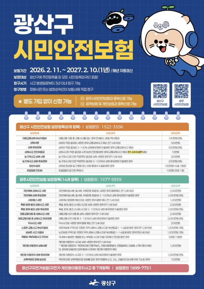 ±¤»ê±¸ ½Ã¹Î¾ÈÀüº¸ÇèÀº µî·Ï ¿Ü±¹ÀÎÀ» Æ÷ÇÔÇØ ±¤»ê±¸¿¡ Áֹεî·ÏÀ» µÐ ¸ðµç ½Ã¹ÎÀÌ º°µµÀÇ °¡ÀÔ ÀýÂ÷ ¾øÀÌ ÀÚµ¿ °¡ÀԵȴÙ. º¸Çè·á´Â Àü¾× ±¤»ê±¸°¡ ºÎ´ãÇÑ´Ù. ½Ç»ýȰ¿¡¼ ´©±¸³ª °ÞÀ» ¼ö ÀÖ´Â ´Ù¾çÇÑ ÇÇÇØ¸¦ º¸ÀåÇϰí, °³Àκ¸Çè°ú Áߺ¹À¸·Î ½Åûµµ °¡´ÉÇÏ´Ù.