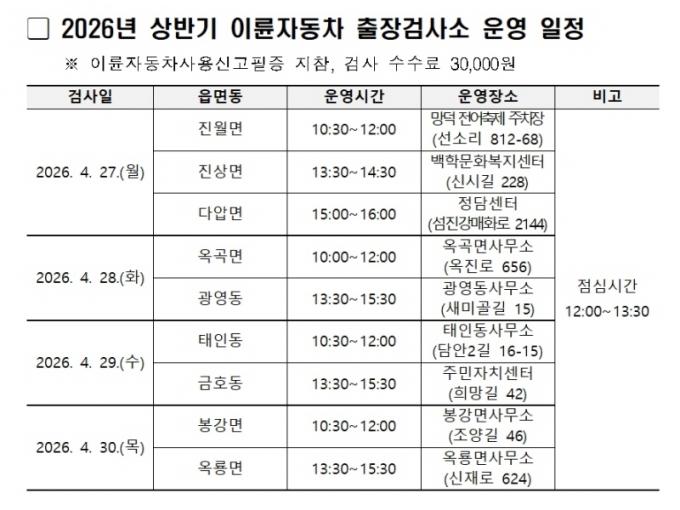 [½Ã»çÁ¾ÇսŹ® = ¿À½ÂÅà ±âÀÚ] ±¤¾ç½Ã´Â ÀÌ·ûÀÚµ¿Â÷ Á¤±â°Ë»çÀÇ ¿øÈ°ÇÑ ÃßÁø°ú °Ë»ç¼Ò°¡ ¾ø´Â Áö¿ª ÁÖ¹ÎÀÇ ÆíÀǸ¦ À§ÇØ 4¿ù 27ÀϺÎÅÍ 30ÀϱîÁö Çѱ¹±³Åë¾ÈÀü°ø´Ü°ú ÇÕµ¿À¸·Î 2026³â »ó¹Ý±â ÀÌ·ûÀÚµ¿Â÷ ÃâÀå°Ë»ç¼Ò¸¦ ¿î¿µÇÑ´Ù°í ¹àÇû´Ù.