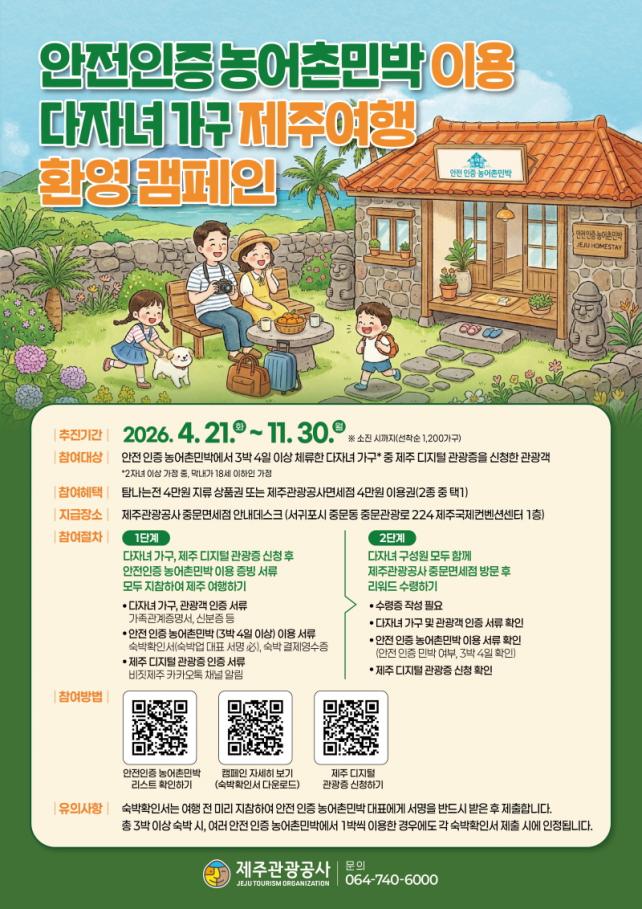 Ä·ÆäÀÎ ´ë»óÀº Á¦ÁÖ¸¦ ¹æ¹®ÇÏ´Â ´ÙÀÚ³à °¡±¸ °ü±¤°´À¸·Î, µÎ ÀÚ³à ÀÌ»ó °¡Á¤ Áß ¸·³» Àڳడ 18¼¼ ÀÌÇÏÀÎ °æ¿ì Âü¿©ÇÒ ¼ö ÀÖ´Ù. Âü¿©¸¦ À§Çؼ´Â µµ³» ¾ÈÀü ÀÎÁõ ³ó¾îÃ̹ιڿ¡¼ 3¹Ú 4ÀÏ ÀÌ»ó ü·ùÇϰí, Á¦ÁÖ µðÁöÅÐ °ü±¤Áõ¿¡ °¡ÀÔÇØ¾ß ÇÑ´Ù.