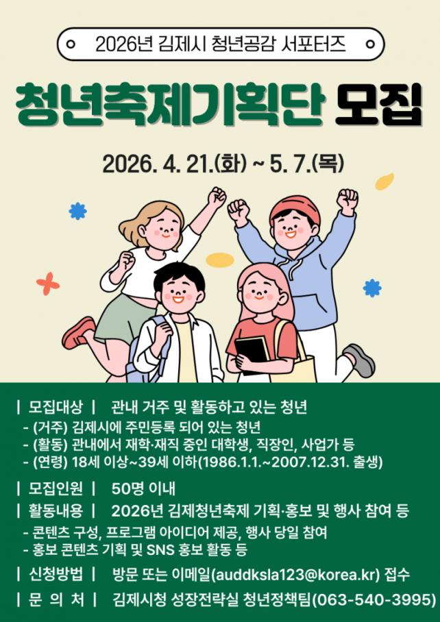 ¸ðÁý ±â°£Àº ¿À´Â 5¿ù 7ÀϱîÁöÀ̸ç, ±èÁ¦½Ã¿¡ °ÅÁÖÇϰųª °ü³»¿¡¼ Ȱµ¿ ÁßÀÎ 18¼¼ ÀÌ»ó 39¼¼ ÀÌÇÏ Ã»³âÀÌ¸é ´©±¸³ª ½ÅûÇÒ ¼ö ÀÖ´Ù. ¸ðÁý ÀοøÀº 50¸í À̳»·Î, ½ÅûÀº ½Ã ¼ºÀåÀü·«½Ç ¹æ¹® ¶Ç´Â À̸ÞÀÏÀ» ÅëÇØ °¡´ÉÇÏ´Ù.