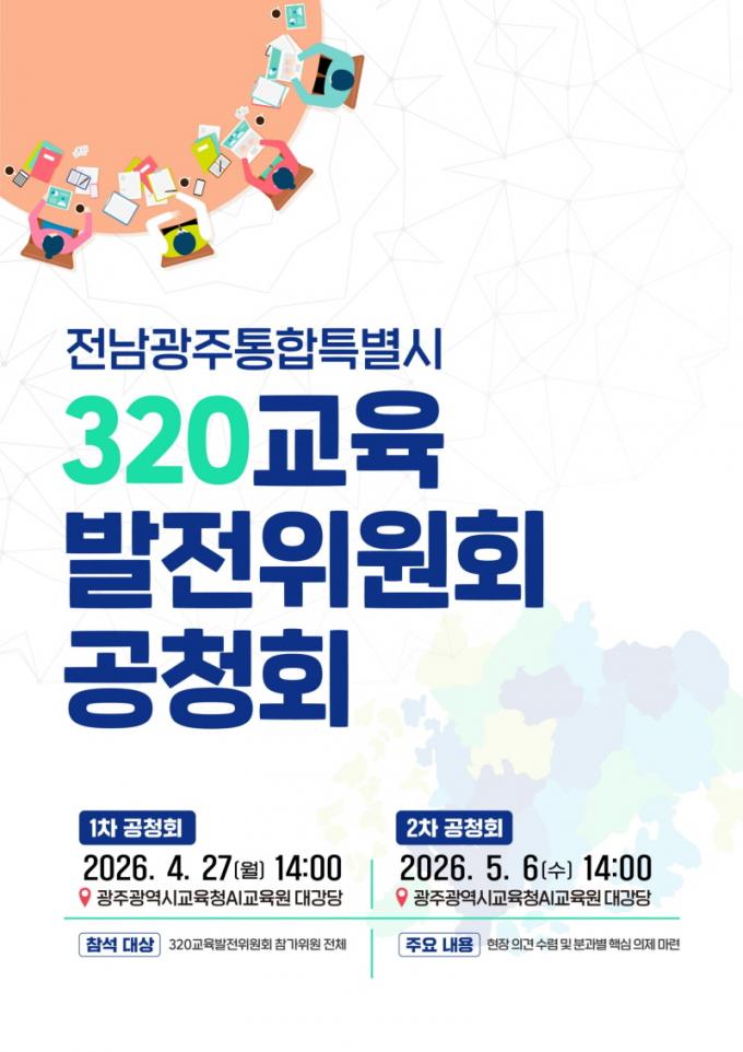 ½Ã±³À°Ã»Àº ¿À´Â 27Àϰú 5¿ù 6ÀÏ ±¤ÁÖAI±³À°¿ø¿¡¼­ ±¤ÁÖ・Àü³² ±³À°ÇàÁ¤ ÅëÇÕ ´ëºñ ½Ãµµ¹Î Àǰ߼ö·ÅÀ» À§ÇÑ ¡®Àü³²±¤ÁÖÅëÇÕÆ¯º°½Ã 320±³À°¹ßÀüÀ§¿øÈ¸¡¯(ÀÌÇÏ 320À§¿øÈ¸) °øÃ»È¸¸¦ °³ÃÖÇÑ´Ù.