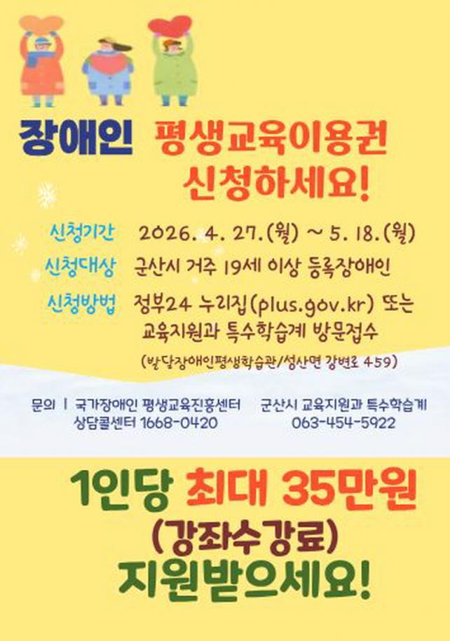ÀÚ¼¼ÇÑ »çÇ×Àº Àå¾ÖÀÎ Æò»ý±³À°ÀÌ¿ë±Ç »ó´ãÄݼ¾ÅÍ(1668-0420) ¶Ç´Â ±º»ê½Ã ±³À°Áö¿ø°ú Ư¼öÇнÀ°è(063-454-5922)·Î ¹®ÀÇÇÏ¸é µÈ´Ù.