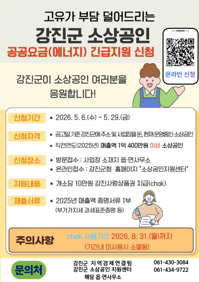 Áö¿ø ´ë»óÀº °ø°íÀÏ ±âÁØ °Áø±º ³»¿¡¼ ´ëÇ¥ÀÚ Áֹεî·Ï ÁÖ¼Ò ¹× »ç¾÷ÀåÀ» ¿î¿µ ÁßÀÎ ¼Ò»ó°øÀÎÀ¸·Î, Á÷Àü ¿¬µµ(2025³â) ¸ÅÃâ¾×ÀÌ 1¾ï 4¹é¸¸ ¿ø ÀÌ»óÀÎ ¾÷ü´Ù. ´Ù¸¸, À¯ÈïÁÖÁ¡ ¹× ¹«µµÀ¯ÈïÁÖÁ¡ µî ÀϺΠ¾÷Á¾Àº Áö¿ø ´ë»ó¿¡¼ Á¦¿ÜµÈ´Ù.