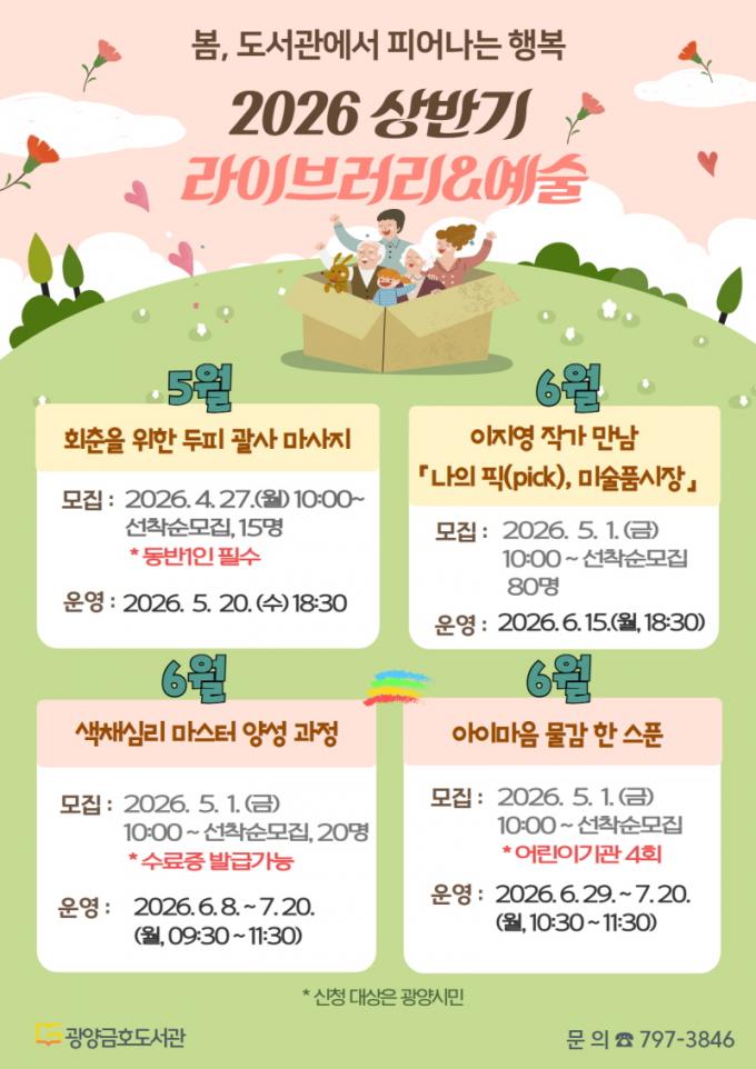 ÇÁ·Î±×·¥ ½ÅûÀº °Áº° ¸ðÁý ±â°£¿¡ ¸ÂÃç 4¿ù 27ÀÏ ¿ÀÀü 10½ÃºÎÅÍ, 5¿ù 1ÀÏ ¿ÀÀü 10½ÃºÎÅÍ ¼±Âø¼øÀ¸·Î ÁøÇàµÈ´Ù. ÀÚ¼¼ÇÑ ³»¿ëÀº ±¤¾ç½Ã¸³µµ¼°ü ´©¸®Áý¿¡¼ È®ÀÎÇϰųª ±¤¾ç±ÝÈ£µµ¼°ü(¢Ï061-797-3846)À¸·Î ¹®ÀÇÇÏ¸é µÈ´Ù.